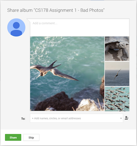 If you want to see what Auto-Enhance does, feel free to turn it on and upload some photographs. If you hover over a photograph you own, you can flip back and forth between the enhanced and original versions. In fact, maybe we can talk about Google's enhancements in class during the lecture on post-processing, but make sure the feature is off when you upload assignments for this course. Uploading Your Assignments to Google+There are at least three ways to upload your assignments. You can read through the three methods and decide to use whichever you prefer. In each case, you will need to create an album; the name isn't particularly important, but you will need to remember it for the next step. We recommend using "CS178 Assignment 1 - Bad Photos" for the first assignment, and using a similar variation for each subsequent assignment. Each photograph you upload should meet at least one of the requirements for the assignment, and you should make sure to cover every requirement with at least one photo. You should upload at least five photographs for the assignment, but no more than ten. While a photo can fulfill more than one requirement, you will need to select exactly one requirement for each photo, which will be used for grading. Uploading using Google+Start on the Google+ Photos page: https://plus.google.com/photos Click the "Upload Photos" on the menu bar.