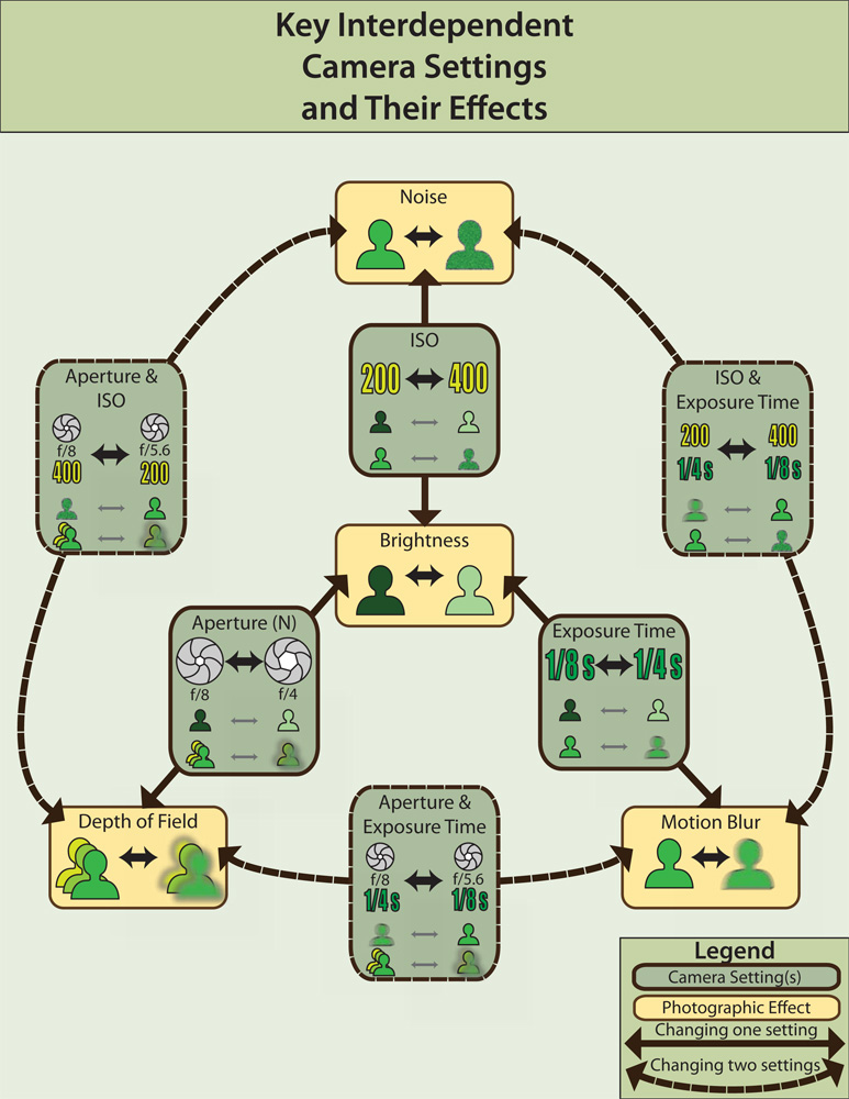 The amount of light recorded by a camera depends on the size of the lens opening (called the aperture) and the amount of time light is allowed to strike the film or sensor chip (called the exposure time). The former is controlled by varying the f/stop, a.k.a. F-number, and the latter is controlled by varying the shutter speed. In a digital camera it is also possible to vary its sensitivity to light by amplifying the voltage observed at each pixel position before converting that voltage to a number. The amount of amplification is called the ISO number. Unfortunately, each of these variables has a side effect: opening the aperture also decreases depth of field, lengthening the exposure time also increases motion blur (including motion blur due to camera shake), and increasing the ISO number also increases image noise. In this applet, we explore these tradeoffs.