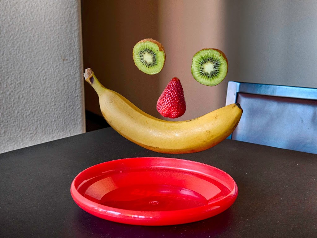 This satisfies Requirement 4 (Levitating Objects). The kiwi pieces are the eyes, the strawberry is the nose, and the banana is the mouth (or maybe the mustache if the red disk is taken as the mouth). This was actually a combination of three HDR pictures. For camera settings, I used f/5.6, 30 mm focal length, ISO-640, and a shutter speed of 1/25 sec. for the middle exposure. I used a tripod, so I didn’t have to worry about hand shake. | ||