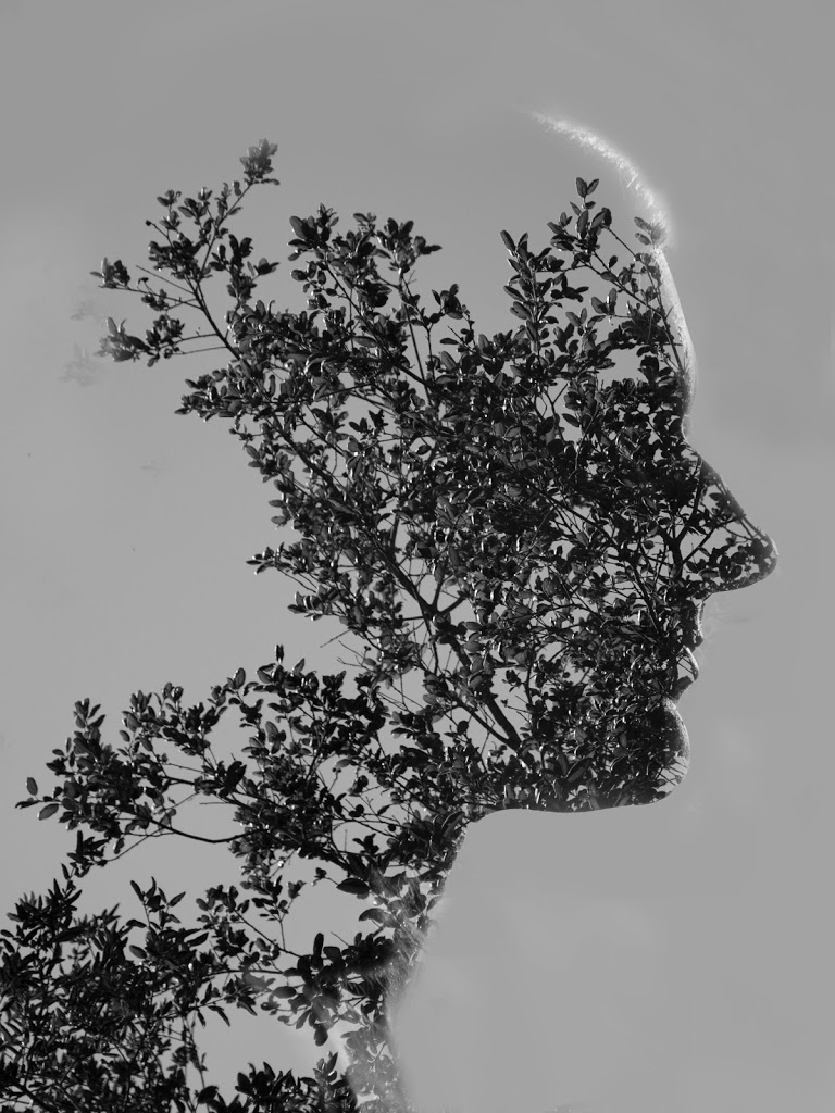 I took this double exposure of a friend outside. For the first shot, I made her face slightly toward the sun to get her face a sort of rim lighting. I made sure to underexpose the shot so I got everything but that rim light to be black. I then took a picture of some tree branches branching from right to left, and merged them using an in-camera feature. With some playing around in photoshop, I settled on a black and white image after I removed the translucent treebranches on the right of her face. | ||