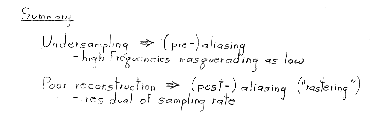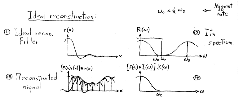 Although we do not manipulate impulses or impulse trains algebraically in this course, you might be wondering how they are defined. The single impulse function, dirac-delta(x), is defined as the limit of a rect function as its width goes to zero. It is drawn as a single upwards-pointing arrow of unit height located at x = 0. (The rect function, you may remember, has unit height, unit width, and is centered around x = 0.) The impulse does not have a value per se at x = 0, but is instead defined as having value = 0 for x <> 0 and integral (from negative to positive infinity) = 1. The impulse train, a.k.a. shah(x), is defined as a sum of shifted impulses. Its Fourier transform, surprisingly, is also an impulse train, where the impulses are spaced as shown above. If you're interested in more details on rects, impulses, impulse trains, and their Fourier transforms, look at these notes from CS 348B.