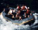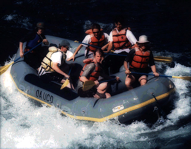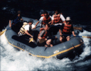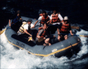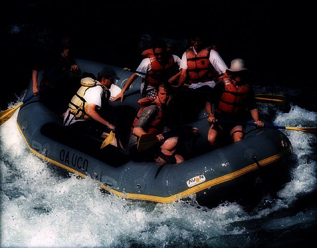 The second test image is an optically scanned photograph taken by a film camera. The optical scanner had a gamma of 1.0, thereby producing a file whose pixel values are proportional to luminance. The third row of the table shows quantization of this image. To my eye, it begins to show quantization artifacts at 5 bits, but less severely so than the synthetic image, probably because of film or digitization noise. Look in particular at the top surface of the leading edge of the raft. In the second row of the table, the same image has been raised to the power 0.5, making pixel values proportional to perceived brightness. The image in the left column shows the result of this gamma transform. The transformed image is then quantized in that space, and resulting quantized images are raised to the power 2.0 to restore the original color levels, so that they can be compared on the same display at the same time to the third and fourth rows. These quantized and restored images are shown in the rightmost three columns. To my eye, this version exhibits fewer artifacts than the third row. For further comparison, in the fourth row the same image has been raised to the power 2.0 - exactly the wrong gamma transform for human viewers, quantized in that space, then raised to the power 0.5 to restore the original color levels. This version clearly exhibits more artifacts than the second or third rows.
