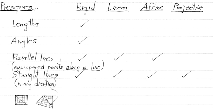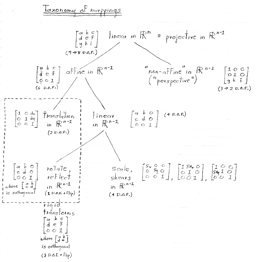 The columns of this chart are assumed to be in the same space. In particular, if we are talking about rigid, affine, and projective transformations in Rn-1 with respect to the taxonomy, then the linear column also refers to linear transformations in Rn-1, not in Rn.