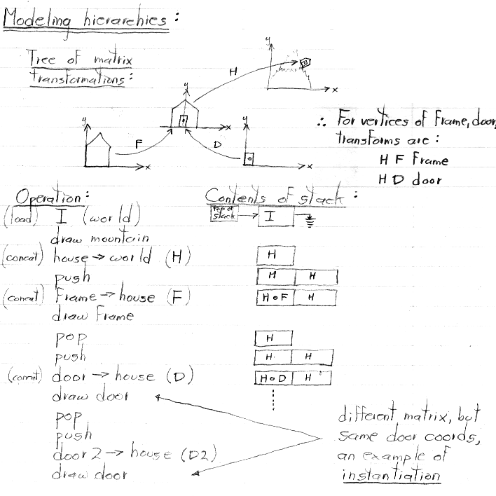 Concatenating a matrix (let's say F) with the matrix at the top of the stack (let's say H), denoted "H circle F" above and said "H composed with F", means perform the matrix multiplication H times F (in that order). We sometimes describe this multiplication by saying that F is right-concatenated onto H. Remember that matrix multiplication is not commutative, so the order does matter.