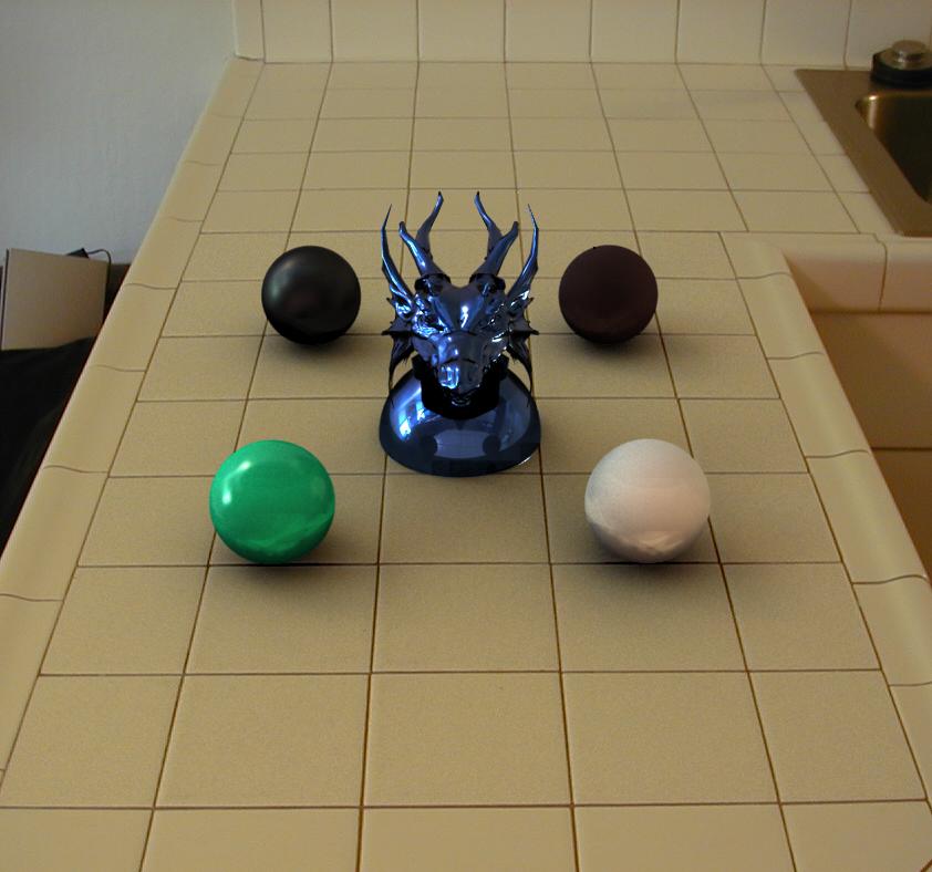 5. Rendering the 3D Scene: I wrote a couple of new lrt modules to create the necessary renderings for the final compositing step. The first module, globalillum, is a new integrator that uses the radiance map computed from step 2 to light the scene. I assumed that the environment is large compared to the rendered scene, and thus only the direction is used in retrieving the radiance from the radiance map. Again, bilinear interpolation was applied where appropriate. Multiple importance sampling was required to reduce noise: the samples are generated using stratified sampling (via LatinHypercube) and then weighted using a combination of the probability distribution function and the brightness of the light in that direction. Irradiance caching is used to estimate indirect lighting effects. The second module I wrote was a trivial integrator that produces only the alpha channel of a scene. This image is required as a matte for the final compositing step.