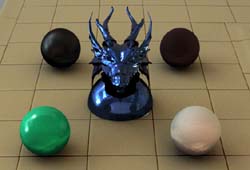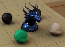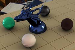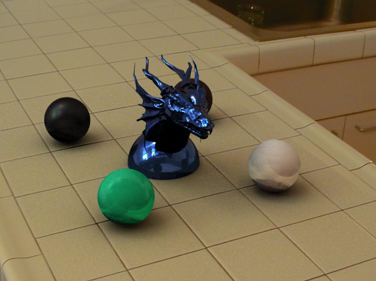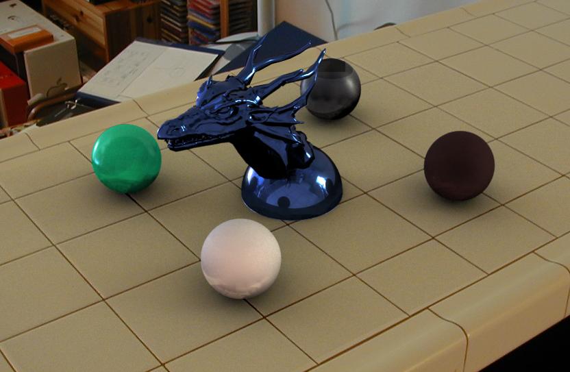These above two scenes show how my image-based lighting implementation functions under two very different lighting conditions. The studio scene has four main light sources of different colours: two windows with sunlight shining in, and two overhead lights. This results in a various shadows in multiple directions, and multiple specular highlights on the plastic sphere and dragon. The Quad scene was taken on an overcast day, so the shadows are much softer and spread out. Both scenes would probably be reasonably difficult to reproduce without image-based lighting techniques. The zoomed in car scene, with the largest poly count of 40k, took the longest to render -- approximately 90 minutes on a 1.79 GHz Athlon. The zoomed out car scene took about 80 minutes, and the studio scenes took about 90 minutes. The artifacts on the spheres in the studio scene are caused by inaccuracies in the irradiance caching method -- this can be reduced by increasing the number of irradiance cache samples at the cost of (much) longer render times. All scenes were rendered for a 1280x960 background plate at 16 samples per pixel, and 64 radiance map samples per pixel sample. The irradiance cache threshold was set at 0.2 for the car scenes and 0.05 for the studio scenes.