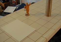 3. Camera Calibration: The next step was to build a 3D representation of my scene. As I did not have access to any sort of sophisticated modeling software, I stuck with a simple geometric plane in a perspective view. I had rough measurements of the camera position and angle; then, I wrote a simple OpenGL utility that allowed me to input the various parameters and interactively adjust them until I had a reasonably good approximation of the perspective and object parameters. The output of this tool was a RIB file that could be directly rendered using lrt.