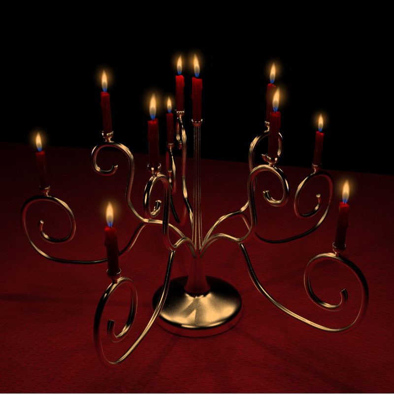 Ben used subsurface scattering and volume rendering to generate candles and flames. [