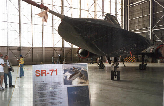 Inside the hangar, a front view of the SR71 blackbird. Its shape is so unusual, it's hard to describe what it feels like to stand next to it...