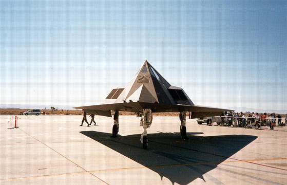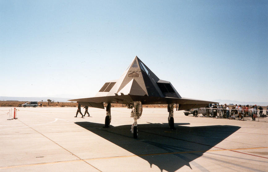 The f117a stealth fighter. Notice how you can see the shape of the plane by its shadow on the ground.