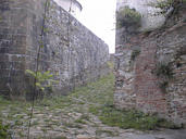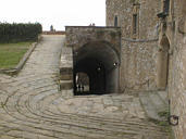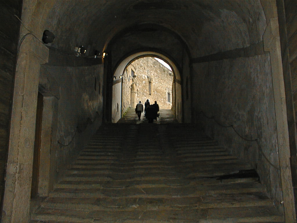 Inside the doorway, past the massive wooden doors, a corridor climbs 30 feet up to the level of the fort. There are ridges for the horses to keep their footing while pulling carriages up this steep slope.
