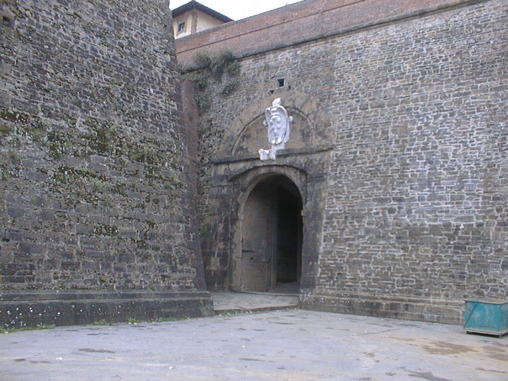 One of the doors to the fort, nestled between the points of the star. The crest of the Medicis sits over the archway.
