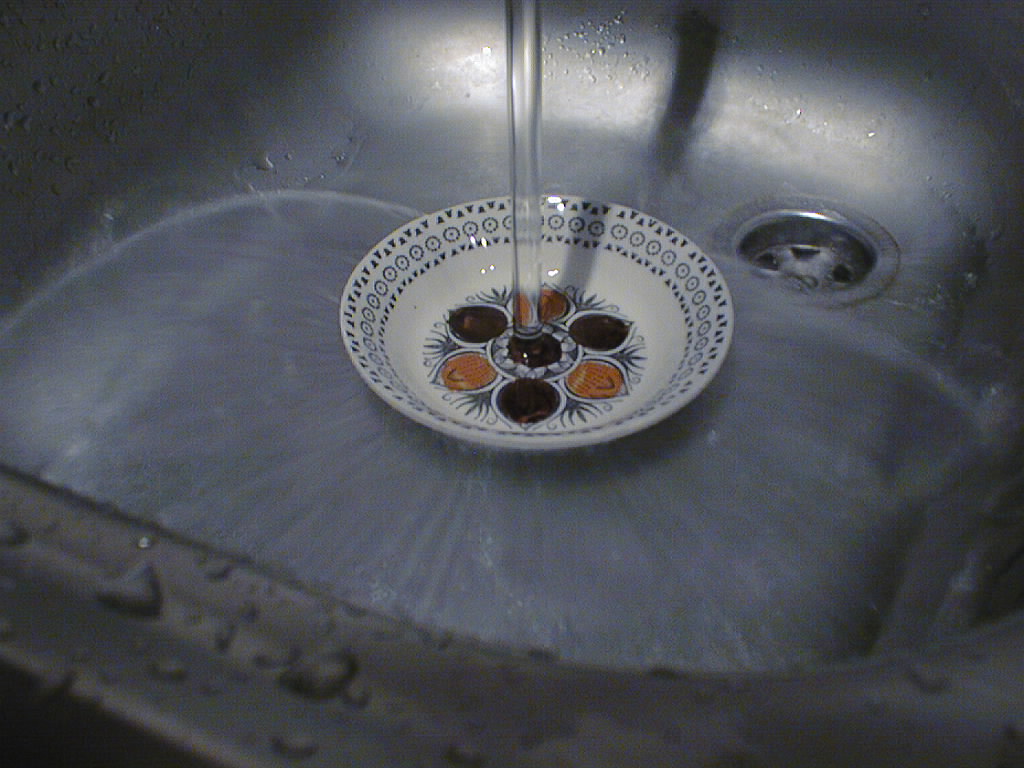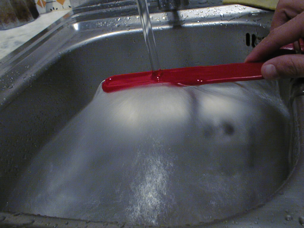 Turning the spoon right-side-up causes the water to shoot out in all directions in a sheet. You can see how variations in the faucet cause concentric circles in the sheet of water.