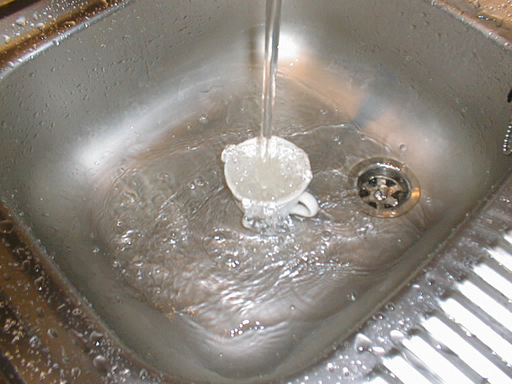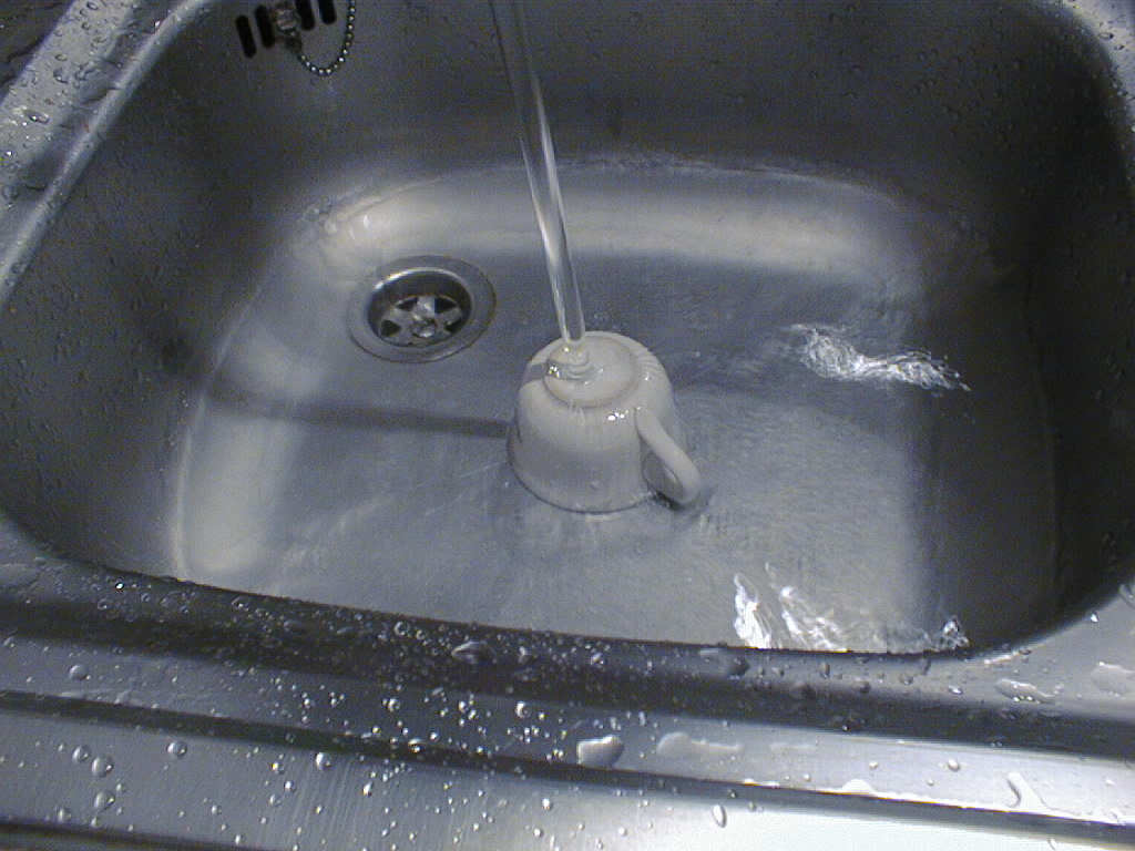 A quasi-stable state: The water entering the cup flows smoothly out of it as a sheet.