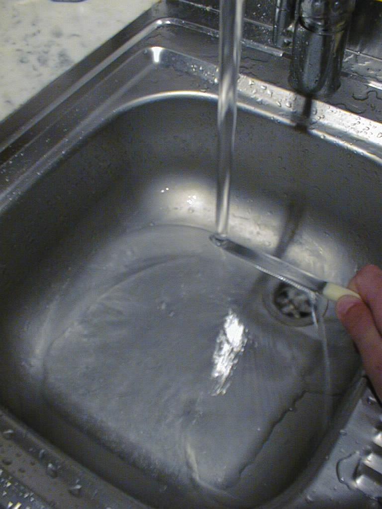 If you tilt the knife handle too much, the laminar flow will break. Here, the water dribbles around the right side of the knife, sticking to the underside and disrupting the flow to the left. So the curtain becomes cloudy, instead of clear.