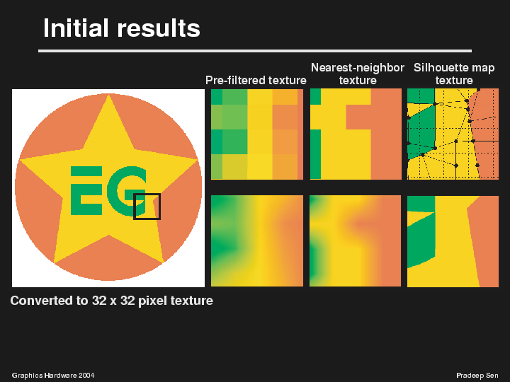 Finally, if we use the silhouette map algorithm we propose in this paper, we see the results in the third column. The top image shows how the silhouette points define the discontinuities in the 32x32 silhouette map. You can see how the texture's cells are being deformed to match the edges of the G and of the star.