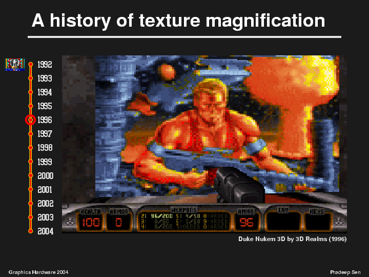 Moving down a few years in the timeline, we next come to Duke Nukem3D, which came out in 1996. We see that the resolution of the bitmap has now increased, primarily due to an increase in available CPU memory. However, the sampling of the texture is still the single-sample "nearest neighbor" approach and the image still looks pixelated.