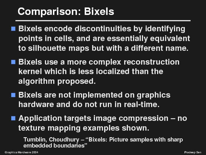Another approach comes from Jack Tumblin's group at Northwestern. Their "Bixels" idea is actually quite similar to our own. In fact, if you study their paper, you will see that bixels are really the same thing as our silhouette maps, only with a different name.